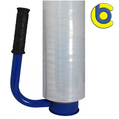 O aplicador manual de filme stretch se acopla ao tubete do filme plástico e promove o encaixe perfeito para ser manuseado e aplicar a película plástica sobre os volumes.